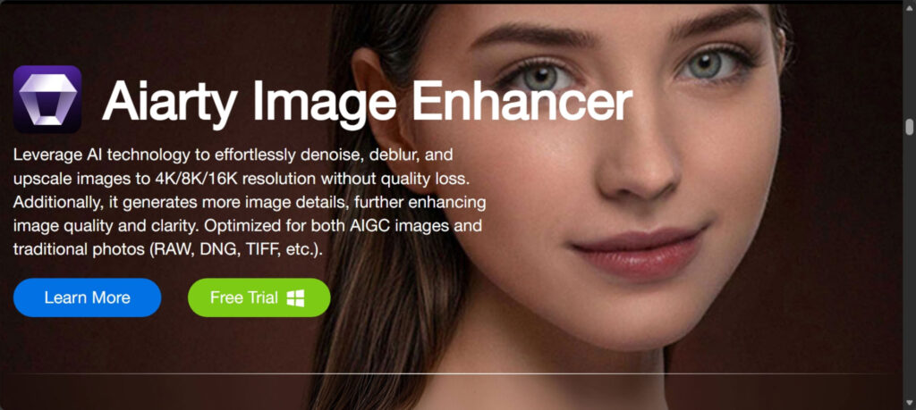 Aiarty Image Enhancer is desktop software that uses artificial intelligence to automatically enhance images. It can sharpen blurry photos, upscale resolution, reduce grain, and improve overall clarity without requiring advanced editing skills.